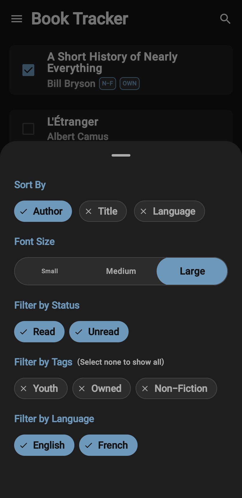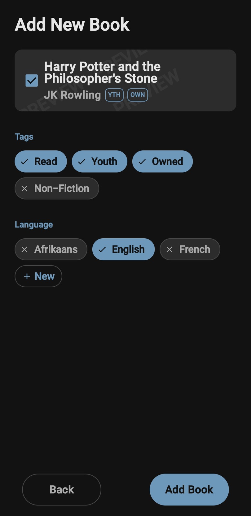 - Tags for non-fiction, owned books, youth and children's books, and read or not read
