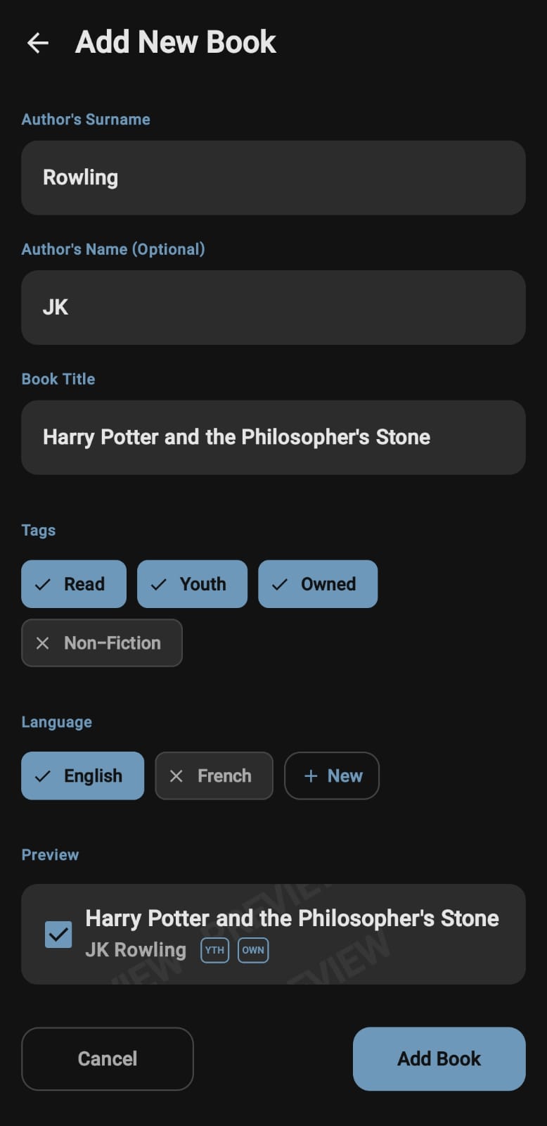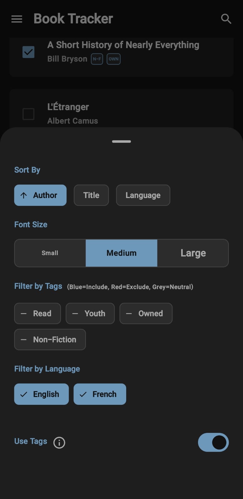 - Tags to differentiate between fiction and non-fiction, owned and not owned books, as well as youth and adult books. (Tip: The tags can be toggled off if you don't want them)